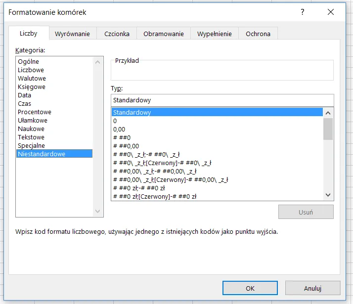 Wybierając w oknie formatowania komórek opcję „Niestandardowy” dostajemy możliwość zdefiniowania własnego typu formatu.