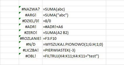 Są to typowe błędy, które Excel może nam wypisać, w komórce gdy coś pójdzie nie tak. Ewentualnie wtedy gdy wszystko pójdzie zgodnie z planem (błąd czasem daje nam pewną wartość diagnostyczną – np. nieobsłużony błąd w WYSZUKAJ.PIONOWO daje nam informację o braku dopasowania wartości. Oddając jednak sprawiedliwość poprawnemu spojrzeniu – taki błąd powinien zostać przechwycony w „biznesowym” arkuszu i obsłużony funkcją – np. poprzez JEŻELI.BŁĄD).