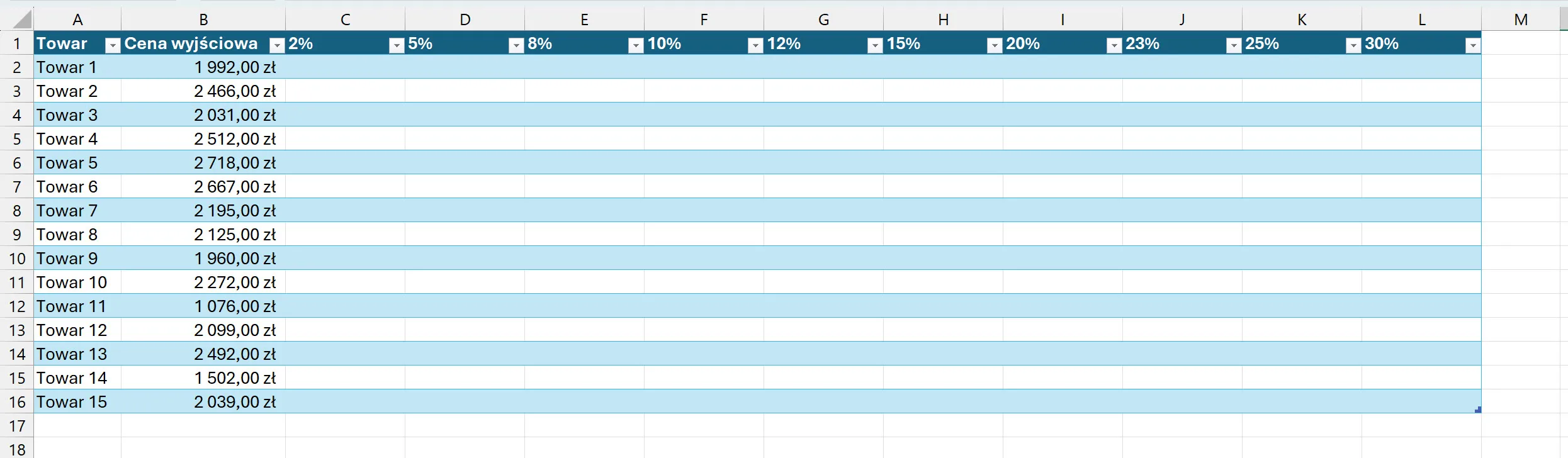 A teraz w wierszu, w którym stoisz zaznacz jednym pociągnięciem myszki dwie komórki: z kolumny Cena wyjściowa oraz 2% (mimo, że być może wydaje Ci się w tym momencie to mało sensowne).