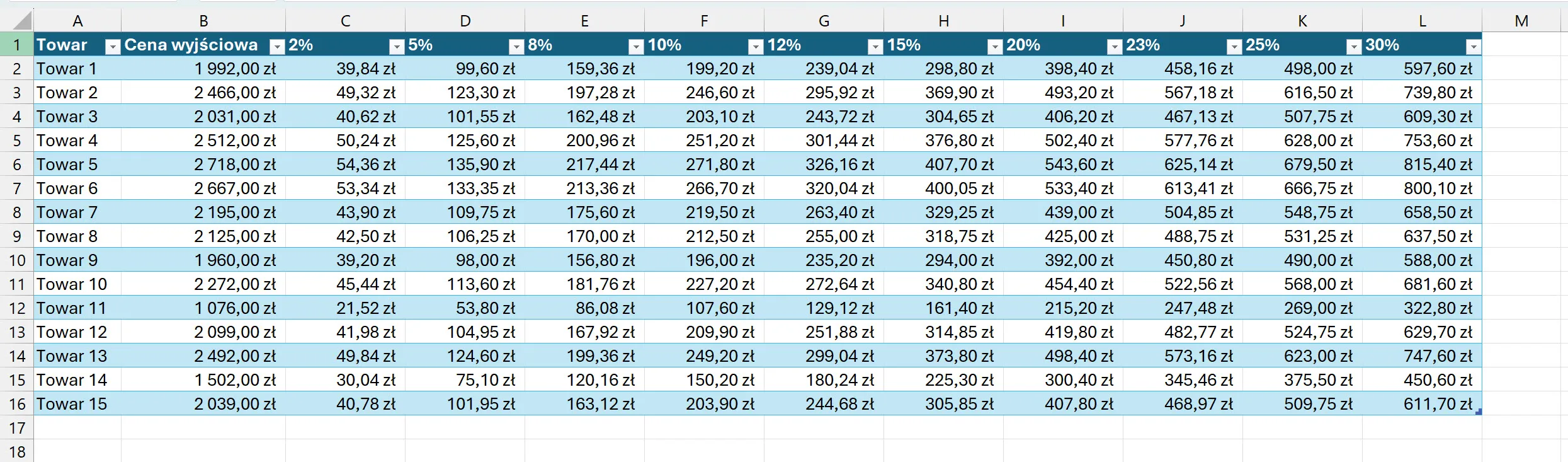 Bez względu na sposób wprowadzenia formuły, możesz ją teraz już śmiało rozkopiować na pozostałe kolumny, bez konieczności wprowadzania jej na nowo przy każdym wariancie rabatu. Gotowa tabela będzie wyglądać tak: