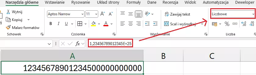 Po zatwierdzeniu numeru Enterem, Excel wykona konwersję typu danych postać naukową (wykładniczą). Taki zapis jest dla większości osób nieczytelny, jeśli format zamienimy na liczbowy to widać, że Excel zamienia wpisane cyfry od 16 pozycji na zera: