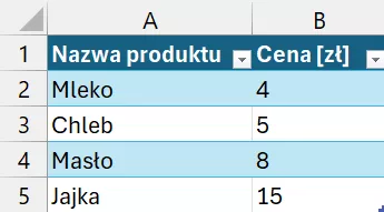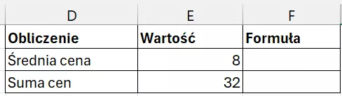 Chcemy w komórce obok obliczyć średnią cenę produktu i sumę cen produktów, a następnie wyświetlić formuły, których użyliśmy, aby można było szybko sprawdzić, co odpowiada za uzyskane wyniki. W tym celu wykorzystamy znak apostrof.