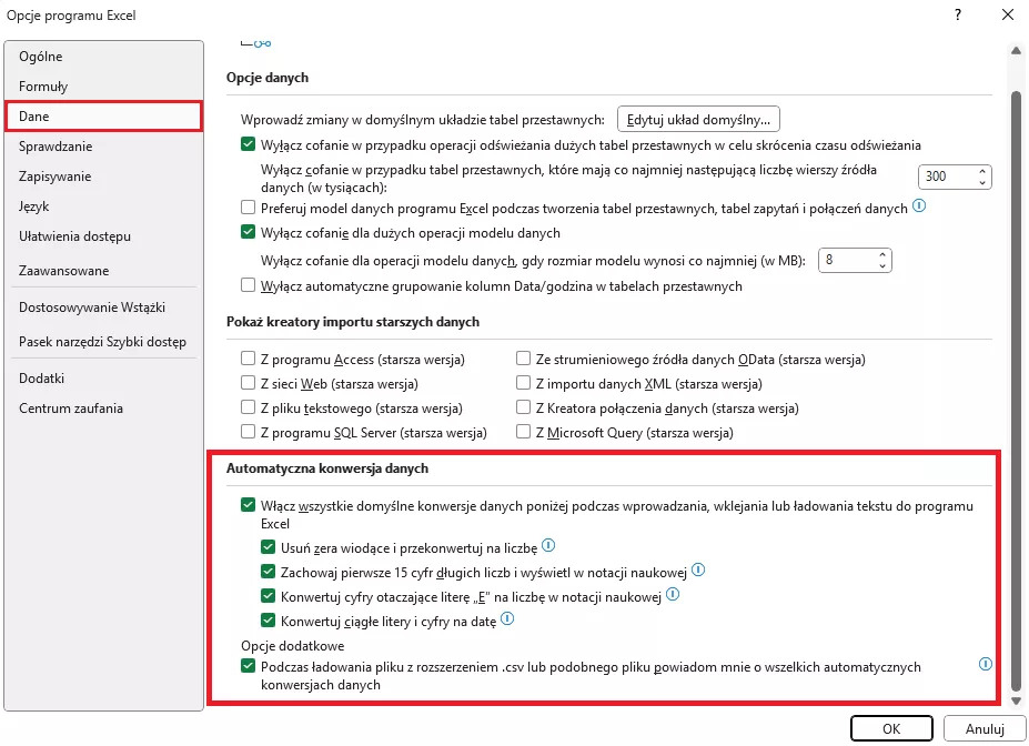 Aby ją aktywować należy wybrać Plik – Opcje – Dane – Automatyczne konwersje danych: