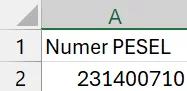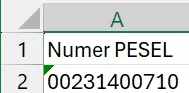 Gdy w komórce chcemy wpisać numer PESEL osoby urodzonej po roku 2000, to taki numer PESEL rozpoczynać będzie się dwoma zerami (2000) albo jednym zerem (po 2000 roku). Excel automatycznie wykrywa format liczbowy, a następnie usuwa zera: