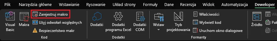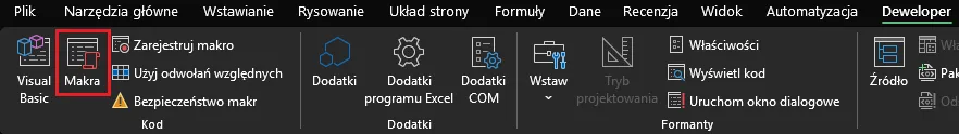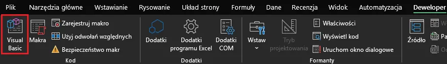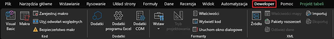 Środowisko programistyczne VBA jest wbudowane bezpośrednio w program Excel, co oznacza, że nie musimy instalować żadnego dodatkowego oprogramowania. Dostęp do narzędzi związanych z makrami uzyskujemy w sekcji Deweloper: