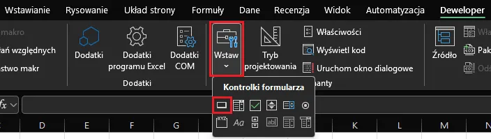 Następnie stworzymy przycisk w arkuszu, który będzie uruchamiał nasze makro. Na karcie Deweloper klikamy Wstaw, wybieramy pierwszą ikonę z listy (Przycisk) i „rysujemy” go myszką na arkuszu: