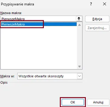 Gdy wybierzemy, gdzie chcemy wstawić przycisk, Excel zapyta nas, które makro chcemy przypisać do przycisku. Wybieramy stworzone przez nas PierwszeMakro i zatwierdzamy: