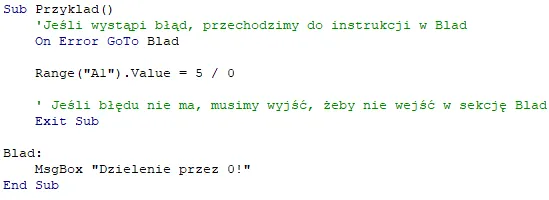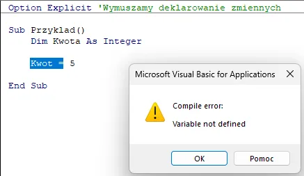 - Brak Option Explicit: Jeśli zapomnimy o tej instrukcji na początku modułu, VBA pozwoli nam używać nazw zmiennych, których wcześniej nie zadeklarowaliśmy. Jeśli zrobimy literówkę (np. napiszemy Licba zamiast Liczba), program nie zgłosi błędu, ale wynik będzie błędny. Option Explicit na początku kodu wymusza deklarowanie nazw, co pozwoli nam uniknąć takich problemów.