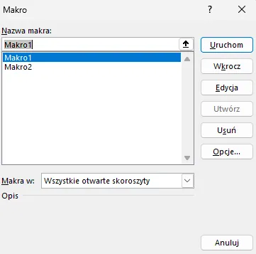 Klikając Makra widzimy podgląd wszystkich stworzonych makr – możemy je tam uruchamiać, edytować lub usuwać: