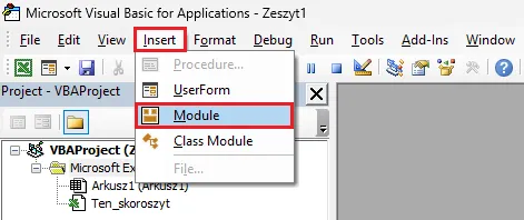 Aby napisać skrypt, musimy stworzyć moduł. W edytorze wybieramy Insert → Module:
