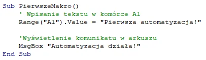 W tym przykładzie napiszemy nasze pierwsze makro, które zmieni treść komórki oraz wyświetli komunikat. Przechodzimy do edytora, wybierając Deweloper → Visual Basic, lub używamy skrótu Alt + F11.