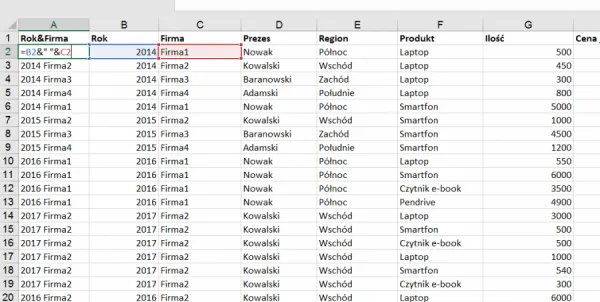 Jednym z rozwiązań jest wstawienie nowej kolumny z lewej strony naszej tablicy, w której połączymy wartości z kolumn, w których znajdują się wartości wyszukiwane. Można to zrobić np. za pomocą operatora &. Dzięki temu będziemy mogli zastosować funkcję WYSZUKAJ.PIONOWO() w znanej nam postaci.