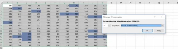 Dostaniemy podobne okienko, jak w poprzednim przykładzie. Tym razem jednak wybieramy ile pierwszych elementów chcemy wyróżnić (w naszym przykładzie 15) i ponownie wybieramy styl formatowania. Tym razem możemy wybrać np. niebieskie cieniowanie komórek.