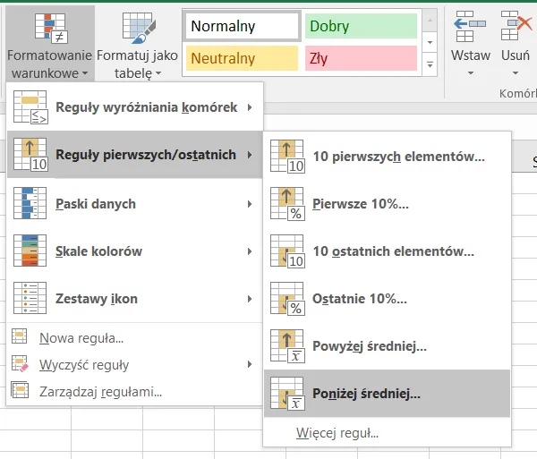 Analogicznie możemy tworzyć reguły wyróżniania komórek dla innych kryteriów, wybierając odpowiednią opcję z menu formatowania warunkowego.