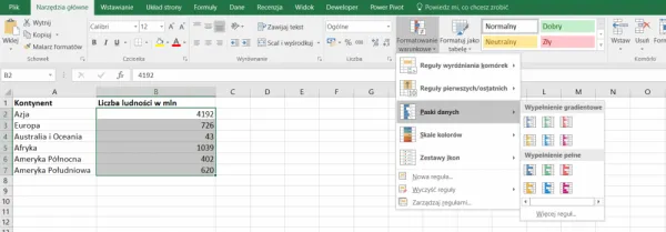Zaczynamy jak poprzednio od zaznaczenia danych i wybrania na wstążce „Formatowanie warunkowe” → „Paski danych”.