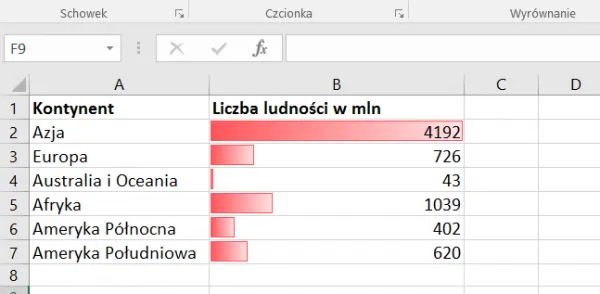 Wykorzystamy paski danych do sformatowania danych dotyczących liczby ludności mieszkającej na każdym kontynencie.