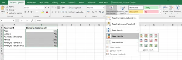 Po zaznaczeniu danych i wybraniu na wstążce „Formatowanie warunkowe” → „Skale kolorów” otrzymamy możliwość wyboru różnych stylów dla skali kolorów.