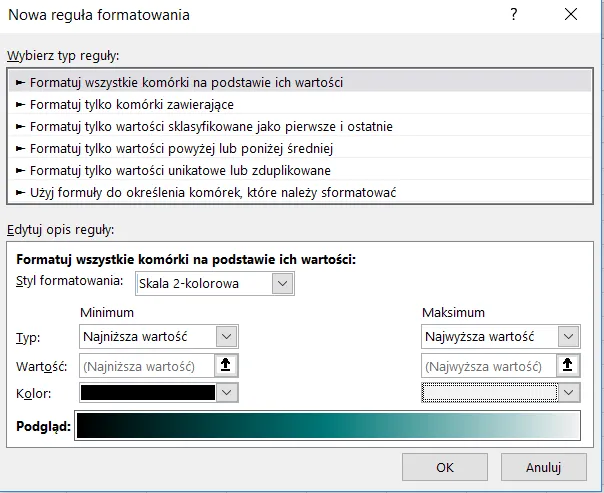 Możemy też wybrać z dolnej części okienka opcję „Więcej reguł” i samodzielnie ustawić kolory dla wartości najmniejszej i największej.
