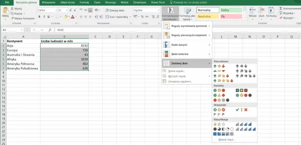 Analogicznie jak skala kolorów działa formatowanie warunkowe za pomocą zestawu ikon. Tym razem jednak zamiast cieniowania w odpowiednim kolorze w komórkach pojawią się konkretne ikony.
