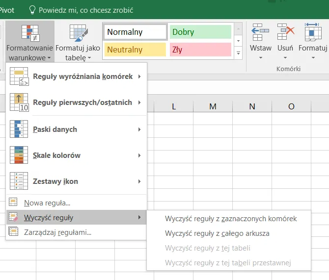 Jeżeli mamy stworzoną dowolną regułę formatowania warunkowego i chcemy ją zlikwidować, to korzystamy z opcji „Wyczyść reguły” dostępnej po kliknięciu „Formatowanie warunkowe”. Mamy wtedy możliwość usunięcia formatowania z zaznaczonego zakresu, z całego arkusza, z bieżącej tabeli lub z bieżącej tabeli przestawnej.