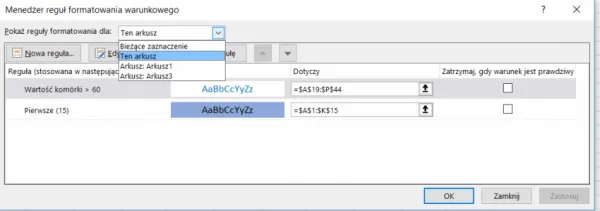 Dostaniemy okno, w którym wybieram w górnej części, aby pojawiały się wszystkie reguły stworzone w danym arkuszu.