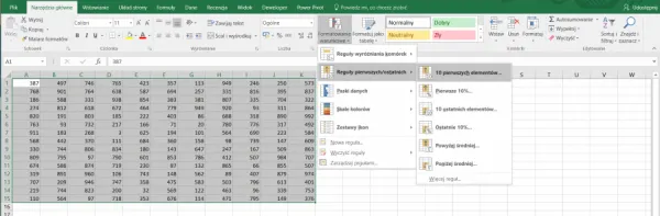 Może się też zdarzyć, że chcemy sformatować 15 najwyższych wartości spośród liczb wpisanych w arkuszu. Do tego wykorzystamy właśnie reguły pierwszych/ostatnich. Po zaznaczeniu danych wybieramy na wstążce „Formatowanie warunkowe” → „Reguły pierwszych/ostatnich” → „10 pierwszych elementów”.