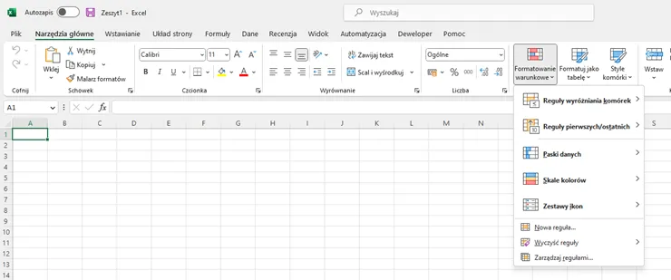 Narzędzie formatowania warunkowego znajdziemy na wstążce w zakładce „Narzędzia główne”.
