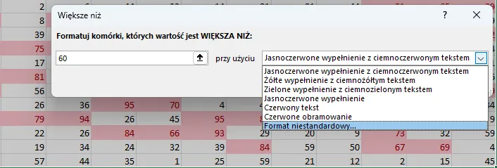 Pierwszym krokiem jest zaznaczenie danych, wśród których chcemy szukać formatować liczby większe niż 60. Następnie ze wstążki wybieramy „Formatowanie warunkowe” → „Reguły wyróżniania komórek” → „Większe niż”. Dostaniemy okienko, w którym podajemy od jakiej wartości mają być większe wartości w komórkach, które będziemy formatować (w naszym przypadku: 60). Z prawej strony okienka natomiast mamy możliwość wyboru stylu formatowania komórek spełniających nasze kryteria. Możemy wybrać jeden z gotowych stylów lub wybrać opcję „Format niestandardowy”.