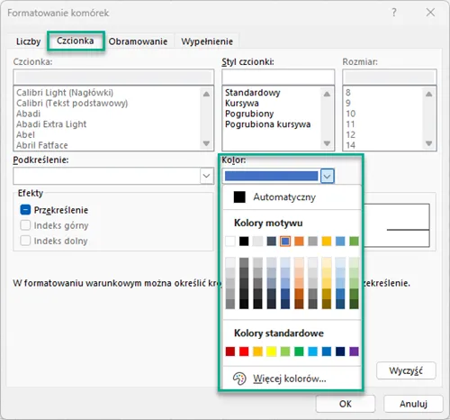 Po kliknięciu tej opcji możemy wybrać np. niebieski kolor czcionki.