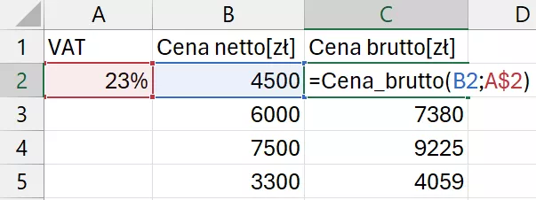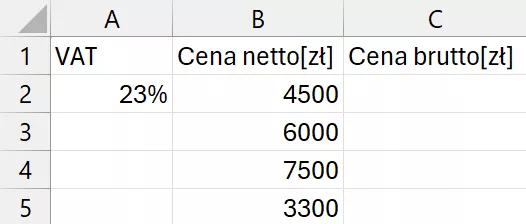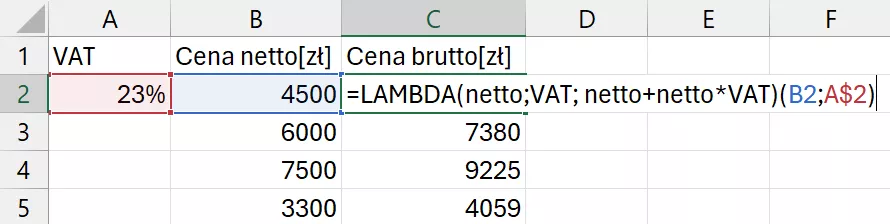 Wyobraź sobie, że chcesz obliczyć cenę brutto z netto przy stawce 23%. Działając na większej ilości danych, zamiast przekopiowywać obliczenia za każdym razem, możesz użyć funkcji LAMBDA(). Mamy następujące dane: