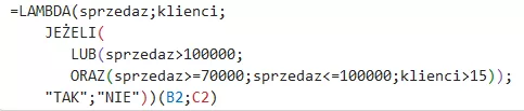 =LAMBDA(sprzedaz;klienci;JEŻELI(LUB(sprzedaz>100000;ORAZ(sprzedaz>=70000;sprzedaz<=100000;klienci>15));”TAK”;”NIE”))