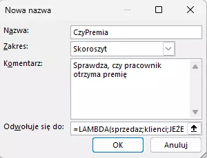 Aby wygodniej z tak przygotowanej funkcji skorzystać, przygotujemy odpowiednią nazwę: otwieramy Menadżer nazw i tworzymy nową funkcję np. CzyPremia.