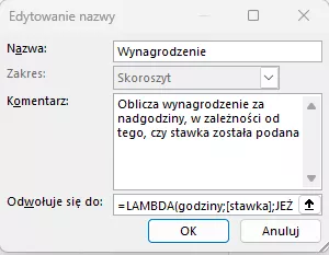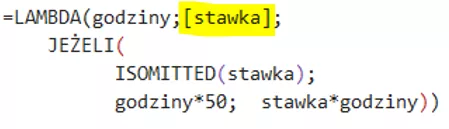 Następnie definiujemy nazwę „Wynagrodzenie”, która obliczy nam wynagrodzenie w zależności od tego, czy stawka została podana czy przyjmie wartość domyślną, przy użyciu funkcji LAMBDA() i funkcji ISOMITTED().