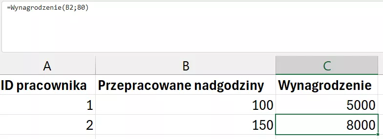 Jak możemy zauważyć, w przypadku gdy nie podaliśmy wartości argumentu „stawka”, nasza funkcja „Wynagrodzenie” przyjęła wartość domyślną 50. Gdy jednak podaliśmy argument „stawka” jako 80, funkcja wykonała obliczenia dla tej wartości.