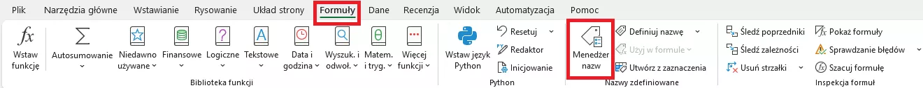 Aby zdefiniować nazwę dla funkcji LAMBDA() należy przejść do zakładki Formuły > Menadżer nazw.