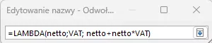 Wprowadziliśmy parametry netto i VAT (nazwa jest dowolna). Następnie wskazujemy jakie obliczenie chcemy wykonać, korzystając z parametrów. W tym przypadku obliczamy cenę brutto z ceny netto. Za pomocą drugiego nawiasu wskazujemy co konkretnie jest naszymi parametrami – komórki B2 i A2. Gdy stworzyliśmy już działającą funkcję LAMBDA() i wytestowaliśmy jej działanie, możemy przygotować własną, czytelną nazwę, którą to potem będzie łatwo wykorzystać w kolejnych arkuszach z danymi.