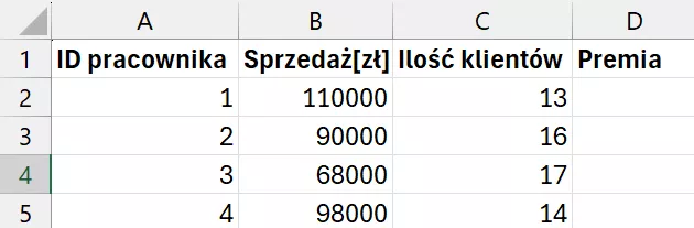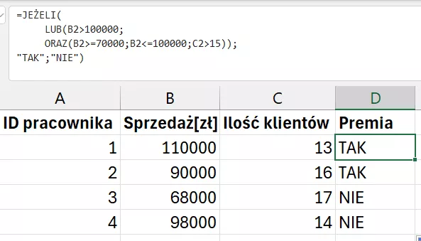 Załóżmy, że firma przyznaje premie pracownikom na podstawie dwóch kryteriów: pracownik otrzyma premię, jeśli jego wynik sprzedaży przekroczył 100 000 zł lub jego wynik mieści się w przedziale 70 000 – 100 000 zł, ale miał więcej niż 15 klientów.
