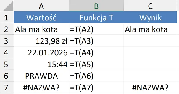 Funkcja T w Excelu — małe narzędzie, które pomaga utrzymać porządek w danych