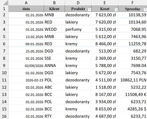 Na pierwszy „rzut oka”, dane są ok. Ale próba uruchomienia formuł, które będą wykorzystywały dane z kolumny data lub Sprzedaz, będzie kłopotliwa, gdyż zawartość tych kolumn nie jest jednolita: „dobre” daty i liczby pomieszane są z wpisami niepoprawnymi. Podobnie problematyczne będzie wykorzystanie tych danych w tabeli przestawnej.