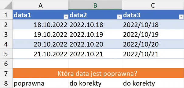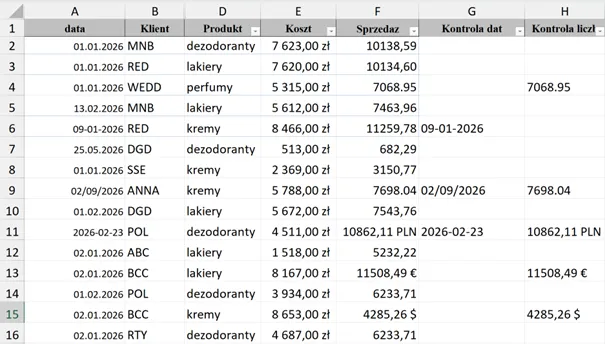 Pytanie – które daty, jak i wartości liczbowe są niepoprawnie przygotowane? Przy 16 wierszach odszukanie niewłaściwie przygotowanych danych zajmie niewiele czasu, ale gdy w arkuszu pojawi się 1600 lub 160 tys. wierszy, będzie to bardzo czasochłonne zajęcie.