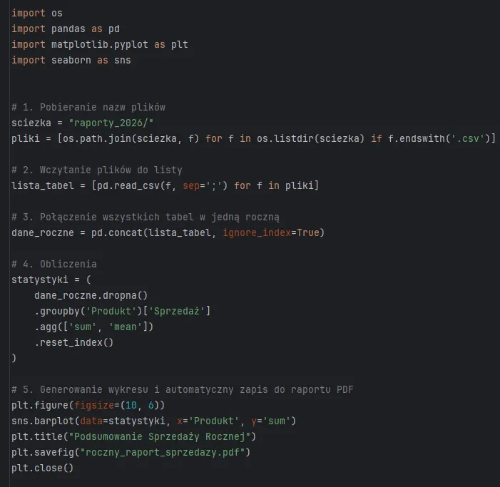 Mamy folder, w którym znajduje się dwanaście oddzielnych plików CSV – po jednym na każdy miesiąc sprzedaży. Naszym celem jest napisanie jednego programu, który samodzielnie je połączy, oczyści z błędów, wykona obliczenia statystyczne i wygeneruje profesjonalne wykresy zapisane bezpośrednio do pliku PDF.