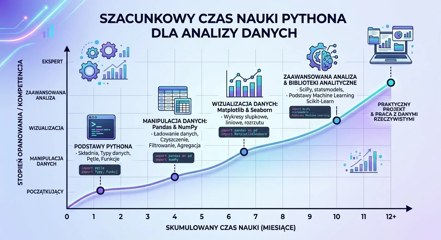 Rozpoczynając proces edukacji w tym kierunku, łatwo zagubić się w natłoku materiałów edukacyjnych i trudnych do weryfikacji szacunkach dotyczących czasu nauki. W tym artykule postaramy się przeanalizować i określić, ile czasu w rzeczywistości może być potrzebne do opanowania narzędzi do analizy danych opartych na języku Python. Krok po kroku pokażemy, jak mądrze zaplanować naukę, aby nie tracić czasu na zbędną teorię i skupić się na umiejętnościach, które faktycznie wykorzystamy w codziennej pracy analitycznej.