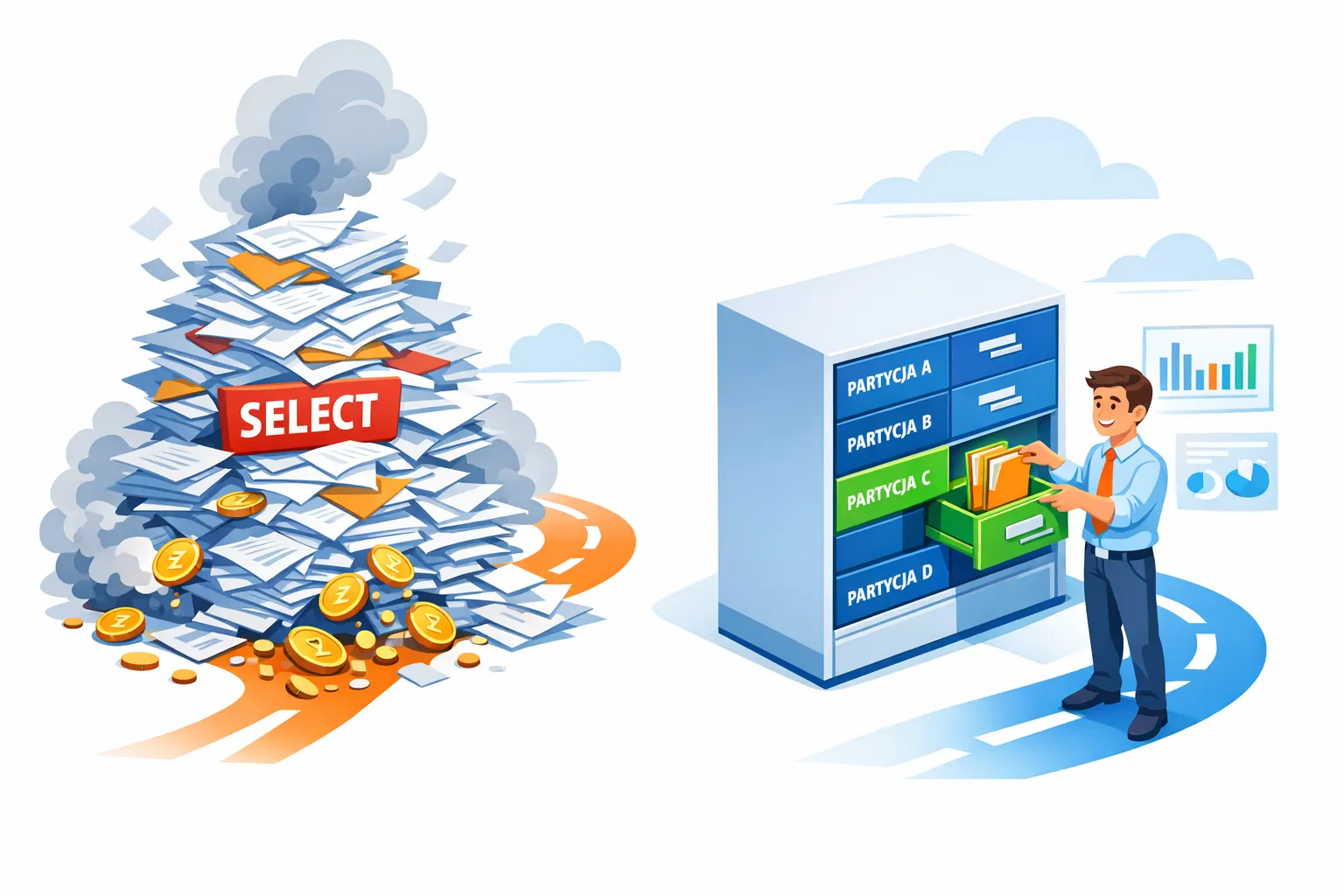 Ponadto, wdrażamy partycjonowanie – czyli dzielimy ogromne tabele na mniejsze „szufladki” (np. po datach), nakładamy na tabele opcję „koniecznych filtrów” (ang. require partition filter). Co zyskujemy? System automatycznie zablokuje każde zapytanie, w którym analityk zapomni podać zakresu dat! Ratujemy w ten sposób budżet przed ludzkim błędem. Dzięki temu nasze zapytanie zamiast wertować 500 GB z całego roku, przeszuka tylko 15 GB z konkretnego miesiąca.