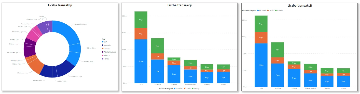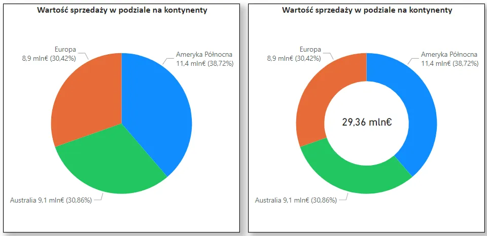 Wykres kołowy lub pierścieniowy sprawdzi się dla prostych zestawień (np. udział procentowy trzech kategorii) jak poniżej. Zwróćcie uwagę, że do wykresu pierścieniowego zastosowałem dodatkową kartę w środku naszego „Donata” aby wskazać dodatkową wartość całości. Sprytna sztuczka wzbogacająca moje dane.