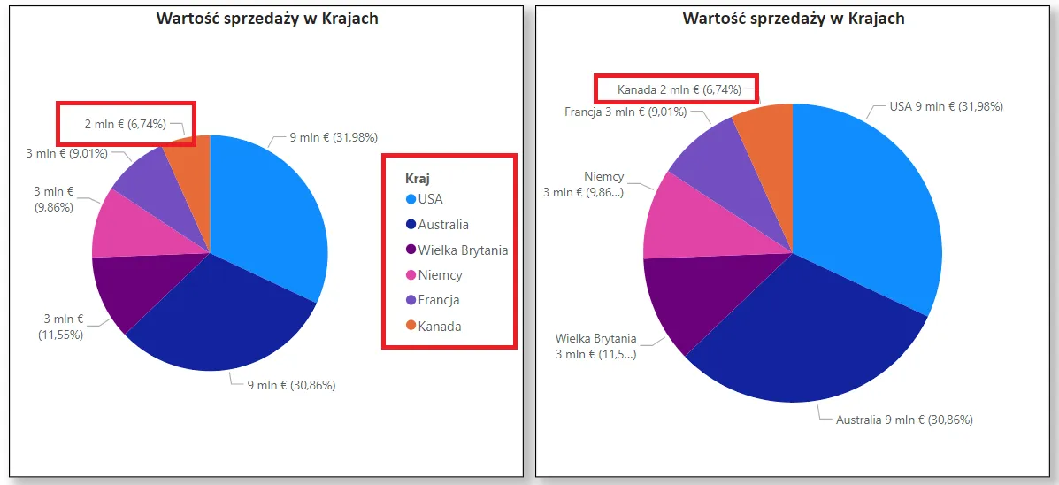 Wszystkie te wykresy przedstawiają te same dane. Zgodzicie się ze mną, że wykres kołowy nie jest najlepszym wyborem do takich danych? Percepcja człowieka nie jest w stanie porównać tych małych wycinków na kole a dodatkowo interpretację danych utrudnia legenda. Zdecydowanie lepiej dla takich danych zastosować wykres kolumnowy lub słupkowy. Na każdej kolumnie widzimy poszczególne kraje i proporcję między danymi.