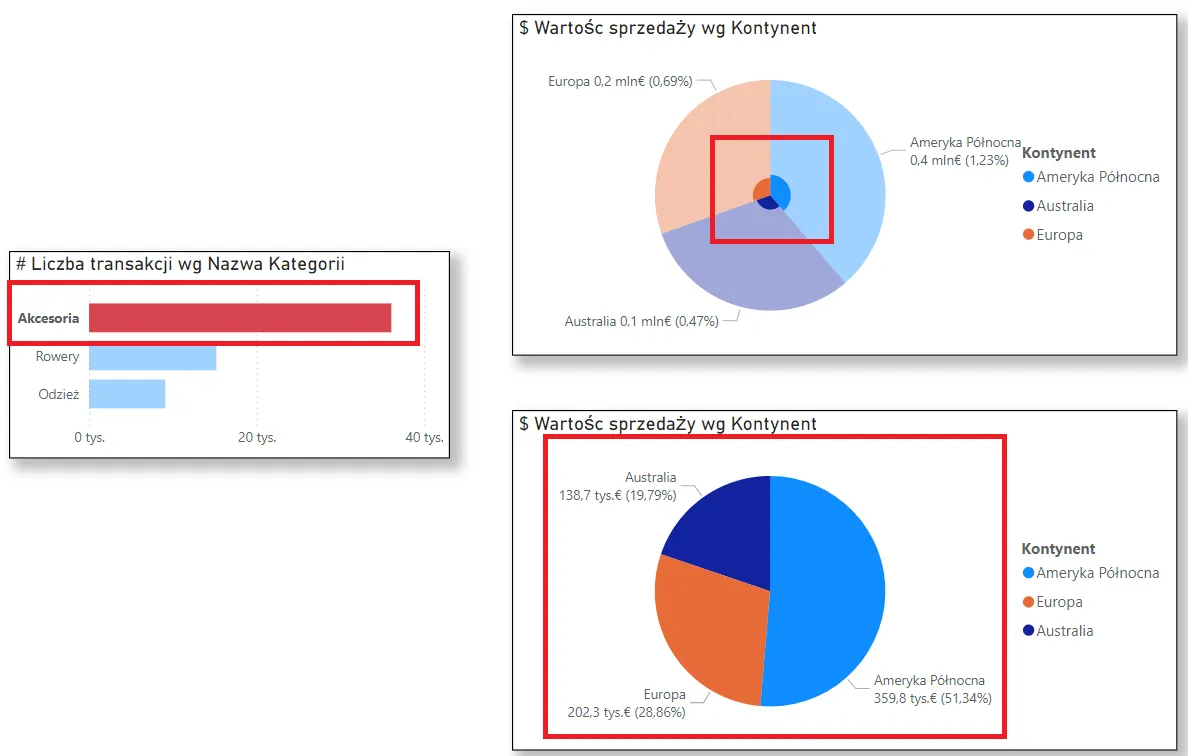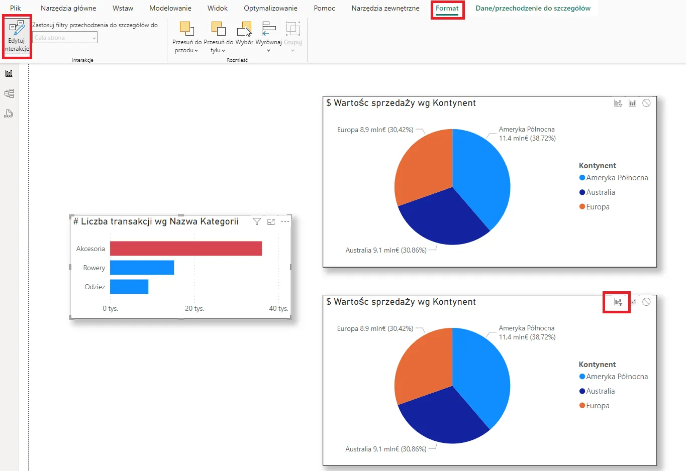 Poniżej przygotowałem uproszczony dashboard przedstawiający pewien problem. Mianowicie gdy kliknę na słupek z nazwą kategorii to filtruje ona wykres kołowy (ten na górze) i pokazuje tylko ten wycinek, który jest odpowiedzialny za sprzedaż w kategorii Akcesoria. Oko człowieka nie jest w stanie ocenić precyzyjnie jaki to jest procent. Dlatego żeby uniknąć na tego typu wykresach takich zdarzeń można wyłączyć interakcję między wizualizacjami gdzie włączamy opcję Filtruj. Wtedy wykres kołowy pokaże nam proporcję tylko dla filtrowanej kategorii czyli w tym przypadku Akcesoriów.