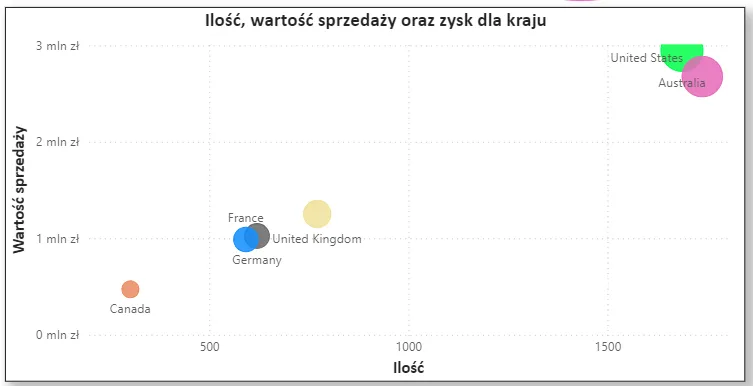 Zależności między danymi znakomicie pokaże wykres punktowy idealny do pokazania relacji między dwiema zmiennymi lub wykres bąbelkowy z trzema zmiennymi (wielkość bąbelków reprezentuje dodatkową miarę)