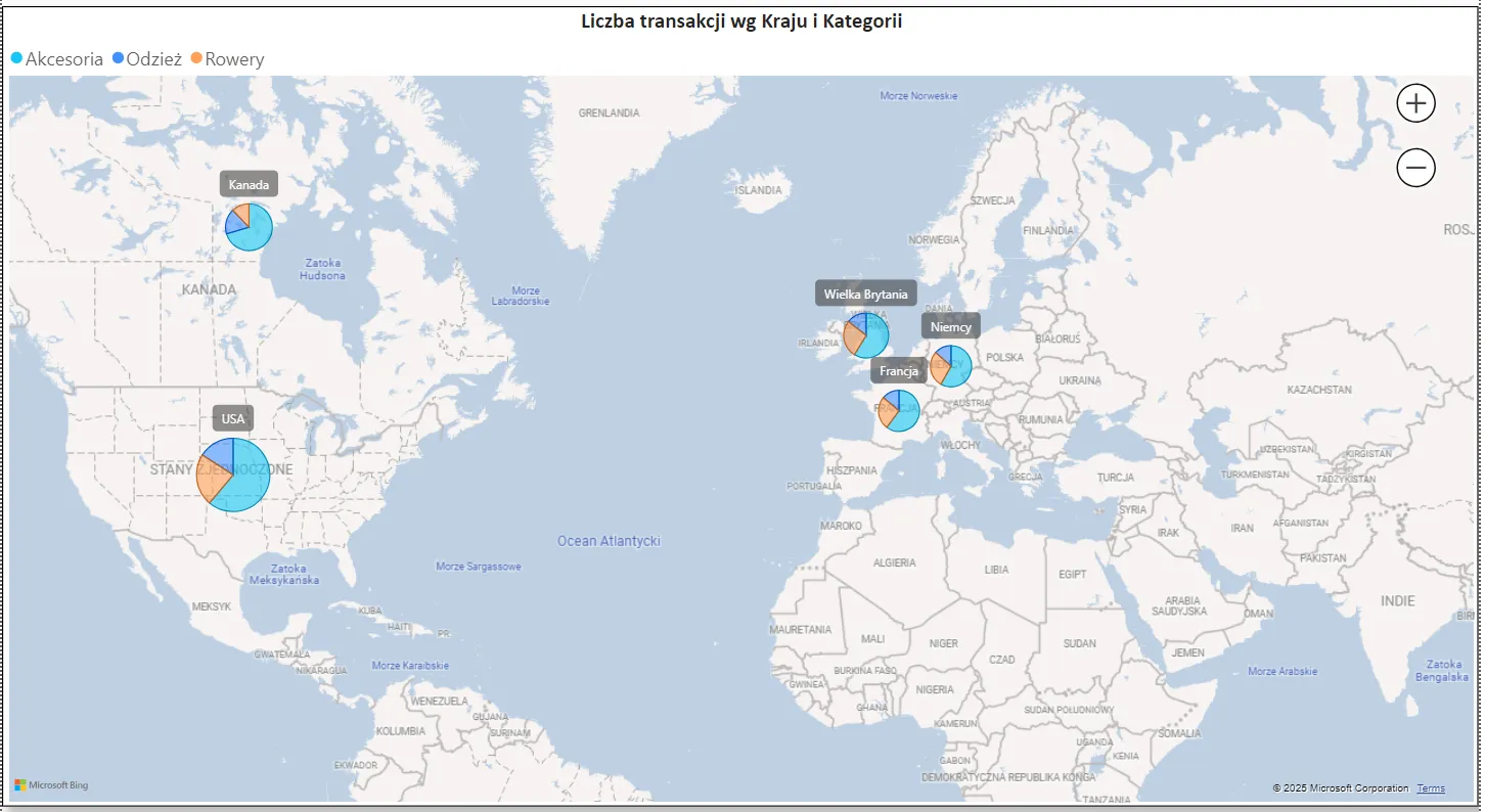 Danych geograficznych nic nie zaprezentuje lepiej niż mapa lub kartogram. Można też użyć mapy z bąbelkami o do pokazania wielkości danych na lokalizacjach (np. sprzedaż wg krajów) – w ten sposób uzyskamy taki efekt naniesienia wykresu kołowego na mapę.