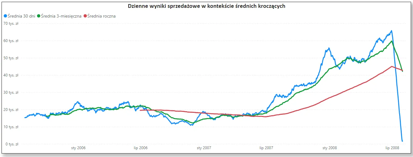 Wszelkiego rodzaju trendy warto pokazywać na wykresach liniowych. Idealnie prezentują one takie dane. Poniżej informacje jak sprzedaż w danym dniu kształtuje się do średniej z ostatnich 30 dni, 3 miesięcy oraz średniej rocznej. Na wykresie liniowym możemy bez problemu odczytać te dane.