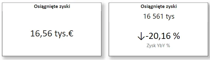Pokazując tylko pierwszą kartę mógłbym wyciągnąć wniosek, że jest super bo osiągnąłem ponad 16 k zysku i otwierać szampana, natomiast gdy zbuduje kontekst prawidłowo to widzę, że nadal ten zysk został wypracowany ale jest on o 20 % niższy niż w zeszłym roku. Szampana pewnie też bym otworzył, ale smakowałby już chyba troszkę mniej😊